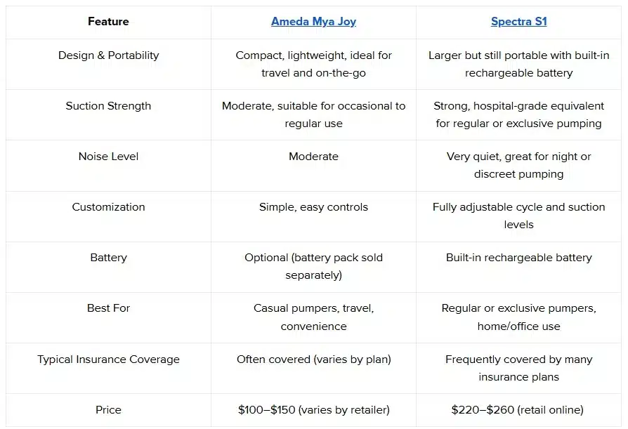 When comparing the Ameda Mya Joy and the Spectra S1, it helps to see how key features stack up at a glance. Both pumps are popular, insurance-covered choices, but they’re built for different pumping needs: one prioritizes portability and ease, while the other emphasizes power, customization, and comfort for regular or longer sessions.