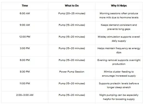 When supply feels low, having a predictable pumping routine can make things feel more manageable. A consistent schedule helps your body receive regular signals to produce milk, while also giving you structure during an already exhausting season.
